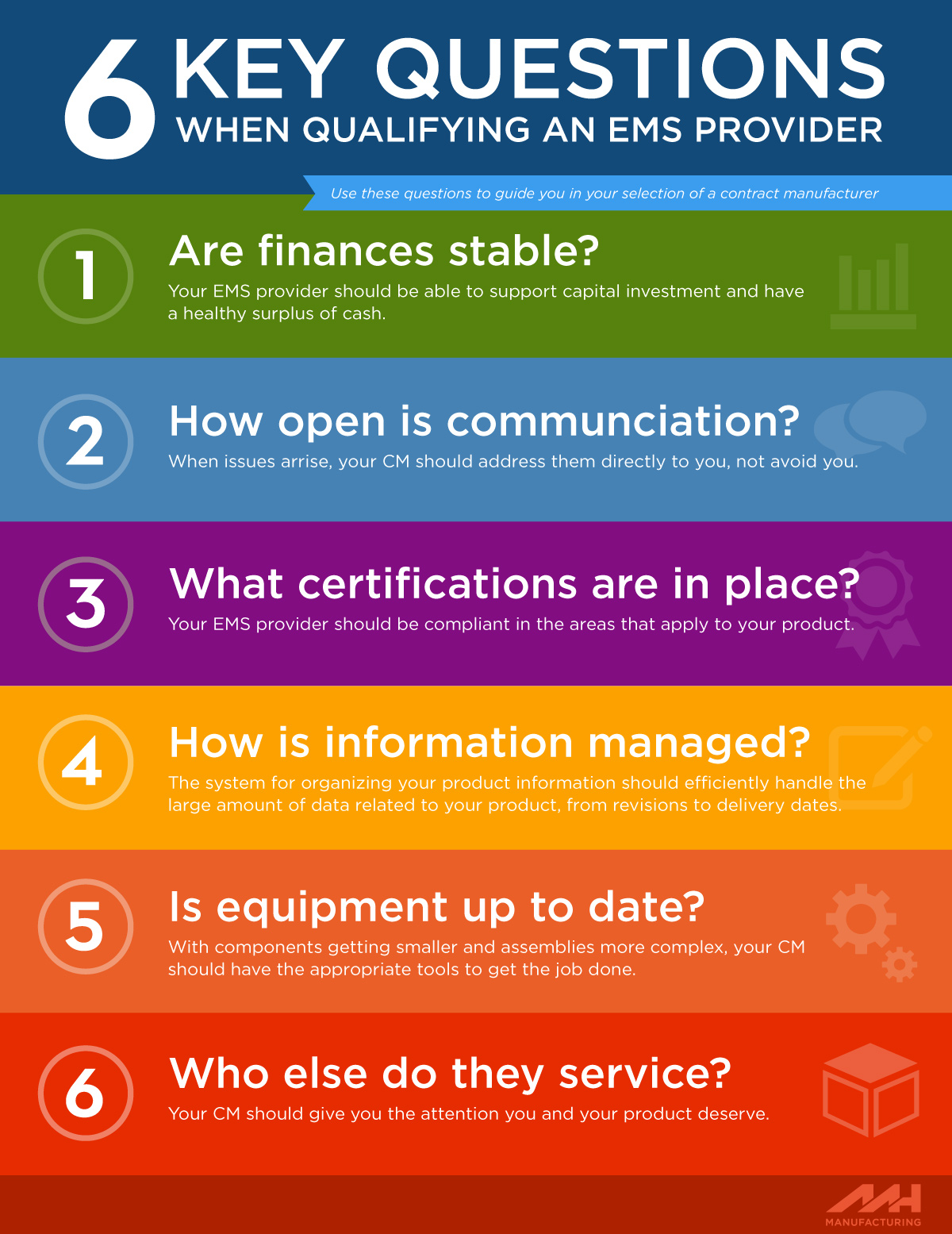 When qualifying an electronic manufacturing service provider (also known as a contract manufacturer), there are many different aspects to consider. Select the right EMS partner and your product will be in good hands – choose the wrong one and it could cost you big time. Use these 6 questions as a starting point: